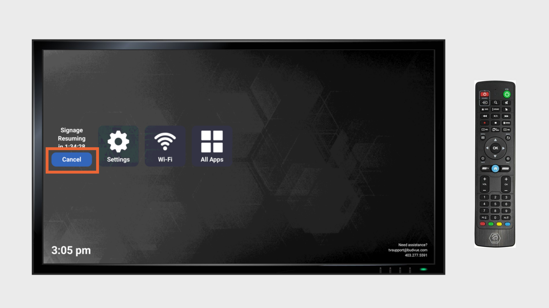 Here, you can see that you’re stuck on the frozen timer. Let’s fix that now! First, grab your BuzzTV remote, which is pictured here.